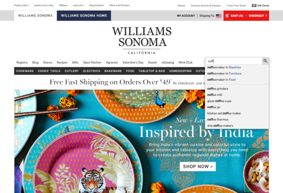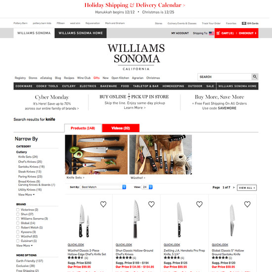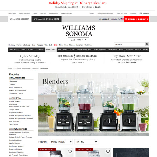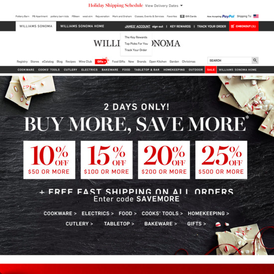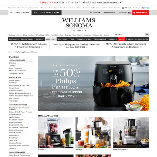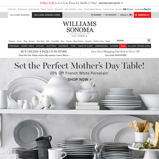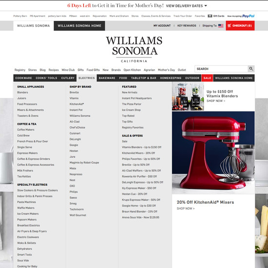 Williams-Sonoma’s Homepage & Category performance is decent. It is especially a state of the art Intermediary Category Pages and Main Navigation that helps Williams-Sonoma’s category UX.