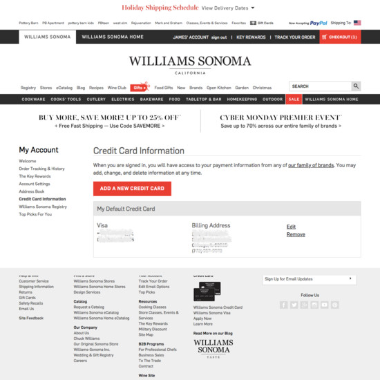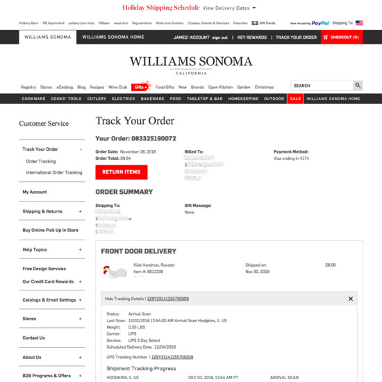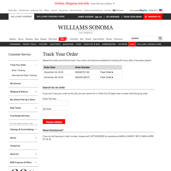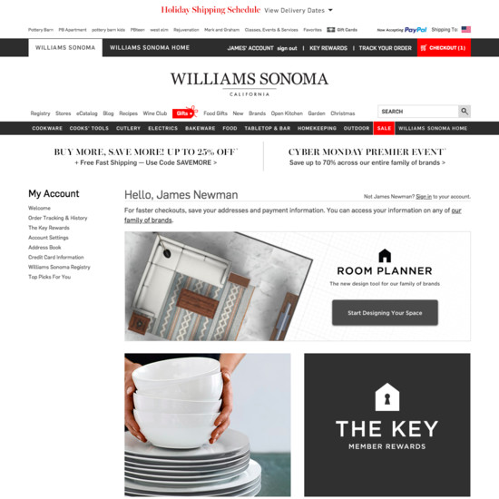 Williams-Sonoma’s Accounts & Self-Service performance is poor. Williams-Sonoma’s account experience is particularly thwarted by usability issues related to mediocre Order Returns, broken Account-Wide Navigation, Structure, & Information, and broken Account Drop-Down.