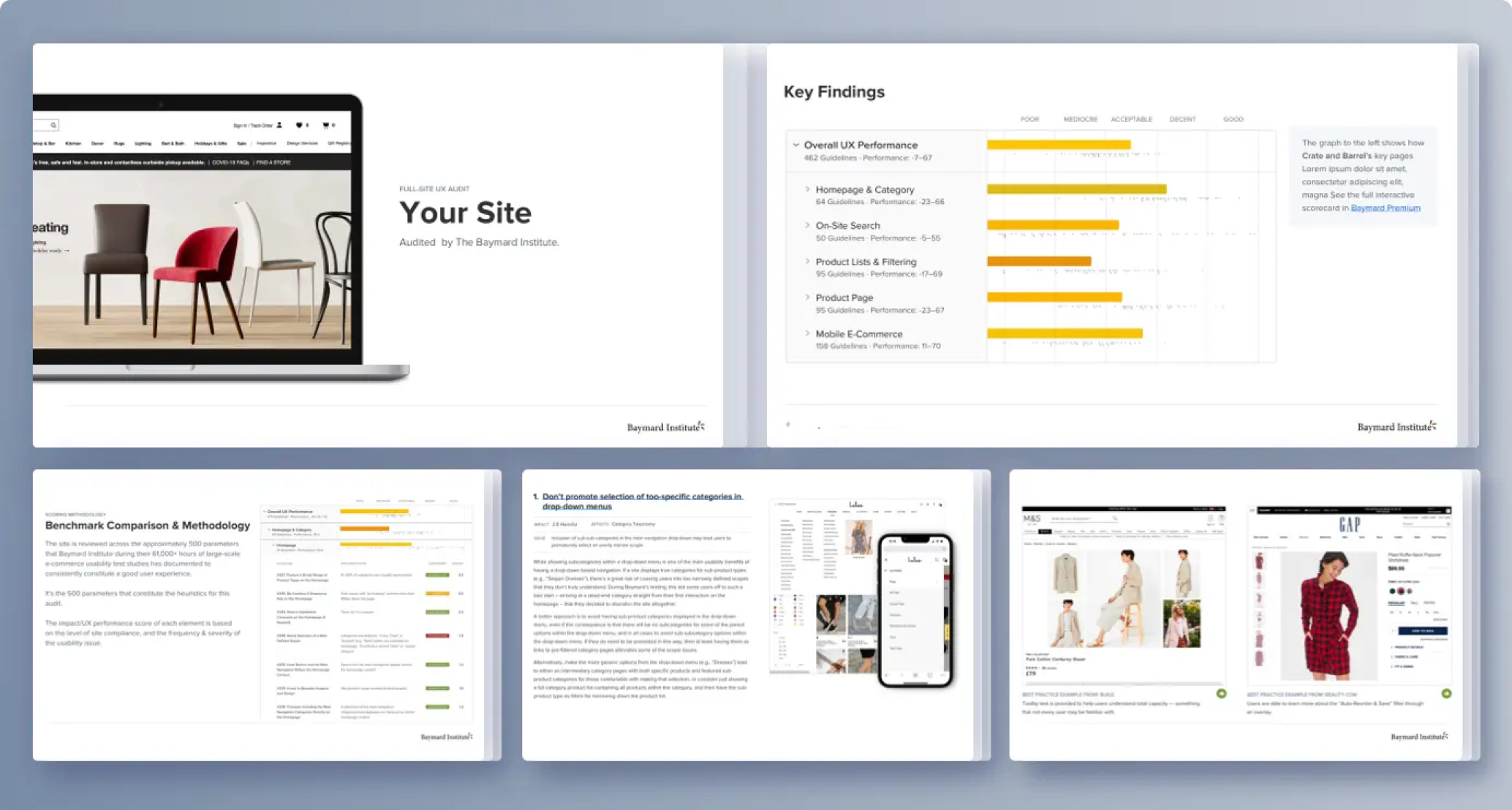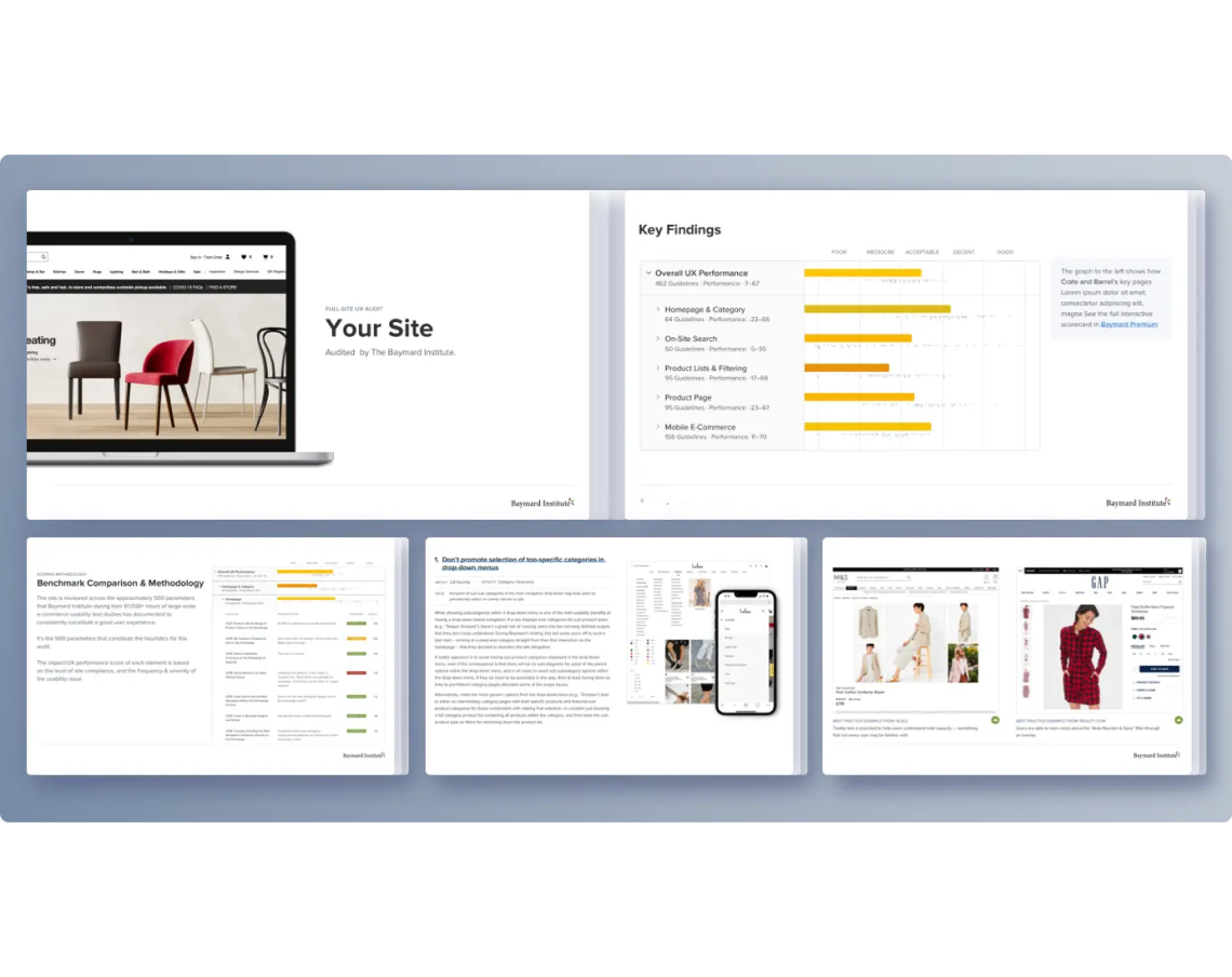 Your UX audit will be delivered as a detailed 120+ page report outlining 40 prioritized and research-backed UX improvements. Alongside the report, you’ll receive UX performance scorecards comparing your site against 500+ parameters and 257 leading sites. We’ll also walk you through the findings in a 2-hour video call with your assigned UX auditor, followed by three additional follow-up calls to support your team as you begin implementing improvements.