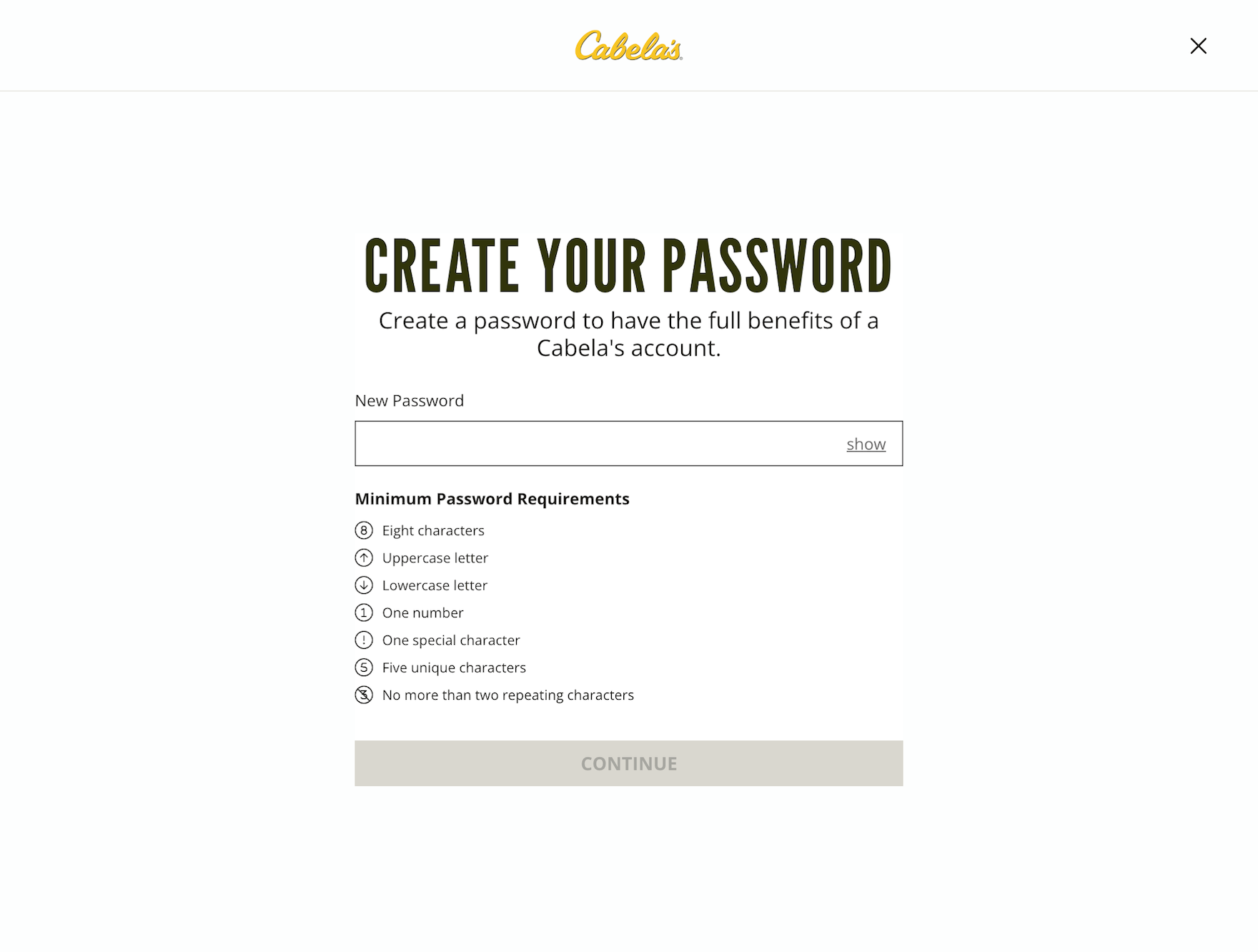 At Cabela’s, users must contend with a lengthy list of password requirements, taking considerable mental effort to craft.