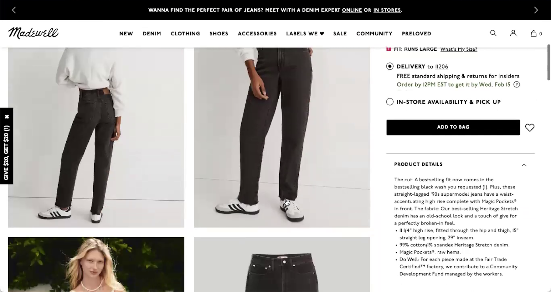 “I’m trying to see…if they would let me just go ahead and ‘ship to store’ right from here, which I guess it doesn’t. At least, I’m not seeing that there.” Despite in-store pickup being featured on product details pages (first image), this participant on Madewell was unable to switch to this option during checkout after wanting to avoid shipping charges (second image). The need to return to the cart or product page to see available alternative fulfillment methods and switch among them presents an undue burden on users who are trying to compare options.