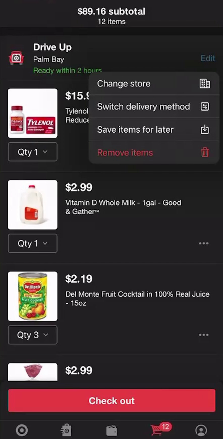 “I’m trying to click ‘Pickup person’, but that’s not it.” This participant shopping for groceries on Target’s mobile app looked for a way to switch from store pickup to local delivery during the one-step checkout process (first image), but there wasn’t a way to switch the fulfillment method. She returned to the cart to select an alternative fulfillment method (second image): “So I’m gonna go back again with my red arrow…‘Switch delivery method’, there we go.” The need to return to the cart to switch among fulfillment methods slows users moving through checkout.