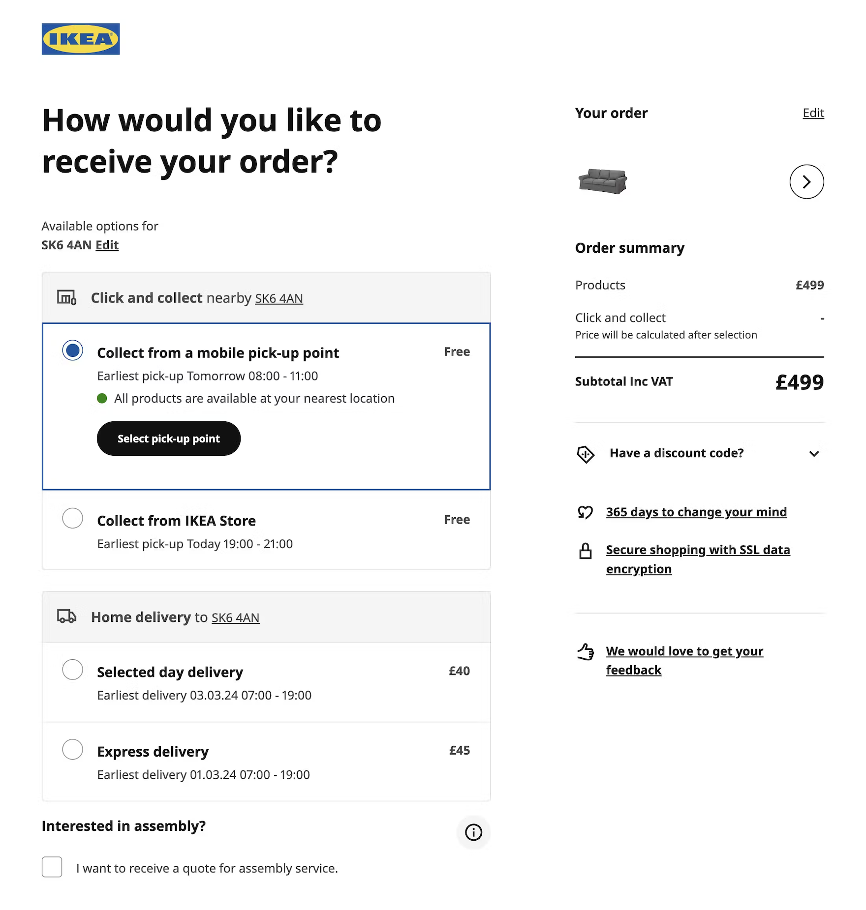 IKEA UK lists all order fulfillment options on a single checkout page, with “Click and collect” — the ideal choice for both cost savings and sustainability — selected by default.