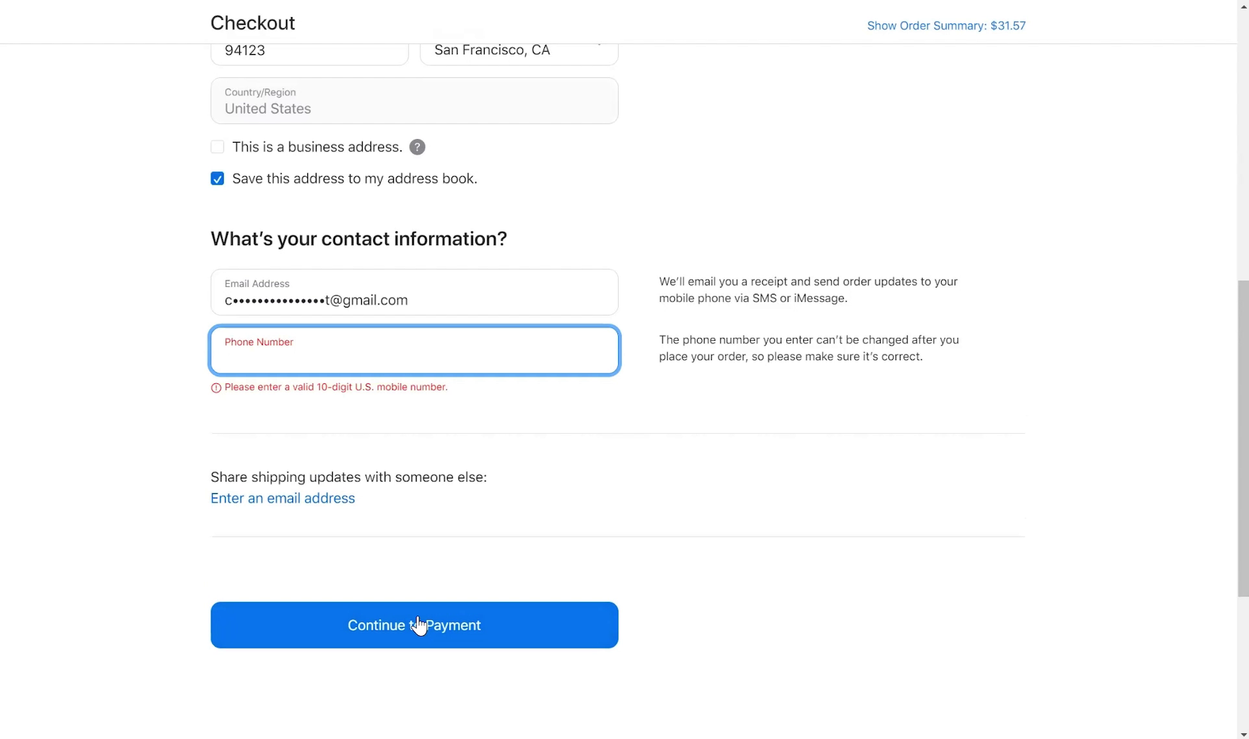 “‘Continue to payment.’ Oh, ‘Phone Number’.” This participant checking out at Apple skipped the “Phone Number” field, preferring to avoid providing this personal detail, but received an error message because it was required.